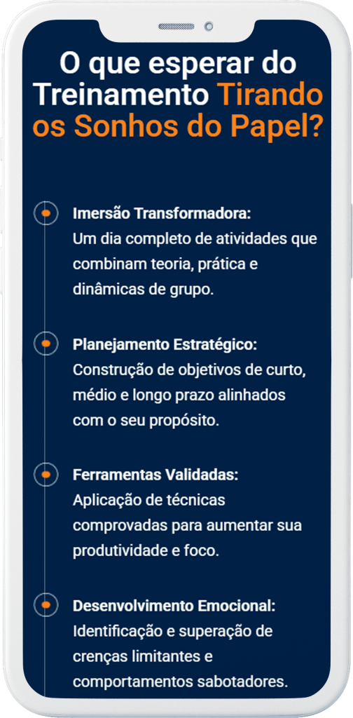 A página de destino Tirando os Sonhos do Papel foi criada para promover um treinamento imersivo focado em auxiliar indivíduos a transformarem seus projetos e sonhos em realidade. Com um design envolvente e informativo, a landing page destaca os principais benefícios do treinamento.